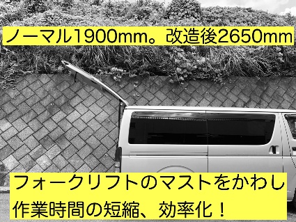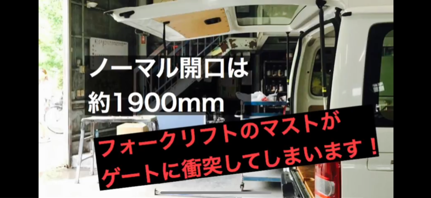 アメージングゲートアップでは、2段階ダンパー付き100系ハイエースから200系ハイエースに乗り換えた方で、今までお使いのフォークリフトが使えない。新車に買い替えたいけどフォークリフトが入らないので200系ハイエースやNV350キャラバンへの乗り換えを諦めている。リアゲートが低すぎる!リアゲートを上げたい!手積みで時間がかかって仕方ない…等でお困りの方。リアゲートダンパーの交換とリアゲートの加工で悩みが解消するかも知れません。2WD、4WD、ローダウン。室内のシートや床貼りの重量等で若干の誤差はありますが、標準ルーフのバンのリアゲートで2600mm前後開口します。通常よりも高く開口させるにあたりダンパーの交換はもちろん、リアゲート、ルーフ後部、ダンパー取り付け位置等の改造を行います。車検には差し支えありませんがリース車両などで気になる方はお問い合わせ願います。その他1BOXカーのリアゲートアップに関する事は何でもお気軽にご相談ください。一味違ったアゲ系、いかがでしょうか?